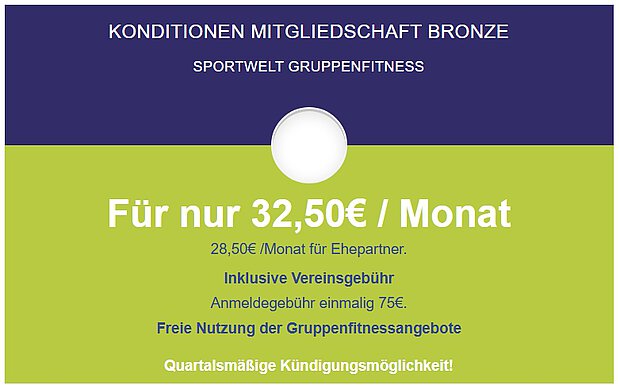 Du hast Spaß an unserer Gruppenfitness, brauchst jedoch kein Gerätetraining? Dann nutze die Bronze-Mtgliedschaft und suche Dir beliebige Gruppenfitnessangebote der Sportwelt-Rheinhausen aus.