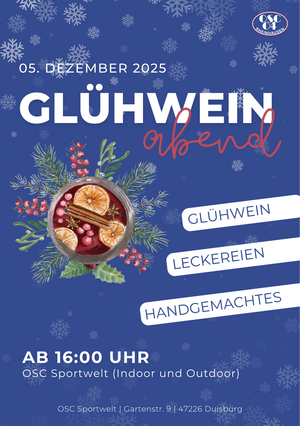 Erstellt von Nelli Anders | | SportweltWeiterlesenAm 5. Dezember findet der Glühweinabend vor und in der OSC Sportwelt statt. Ab 16:00 Uhr werden Glühwein, Leckereien und Handgemachtes angeboten.